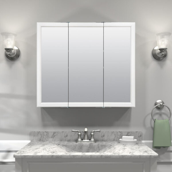 Add style and functionality to your bathroom with the Zenna Home 30 in. × 26 in. Tri-View Framed Surface Mount Medicine Cabinet. Designed with three mirrored doors, this cabinet provides a wide, multi-angle viewing area that makes grooming and daily routines easier. Behind the sleek mirrors, adjustable interior shelves offer customizable storage for toiletries, medications, and other essentials.