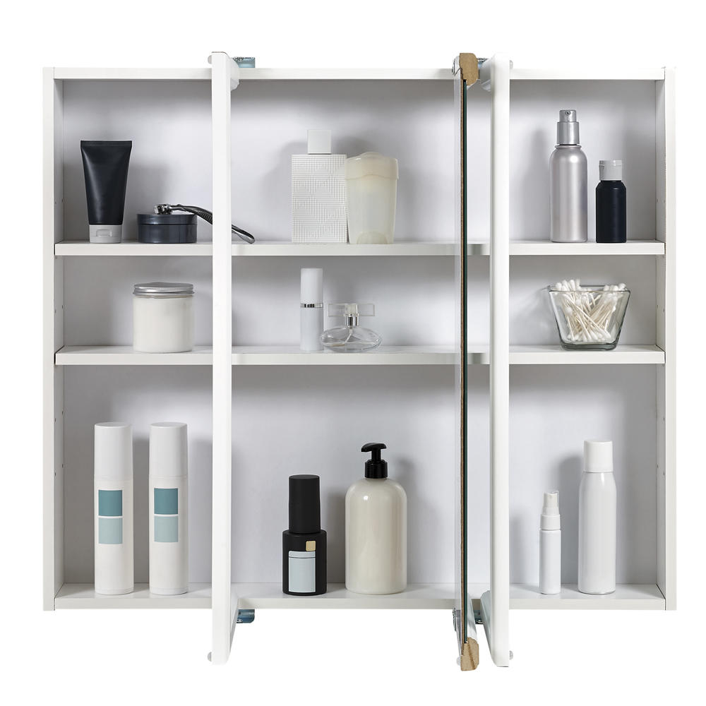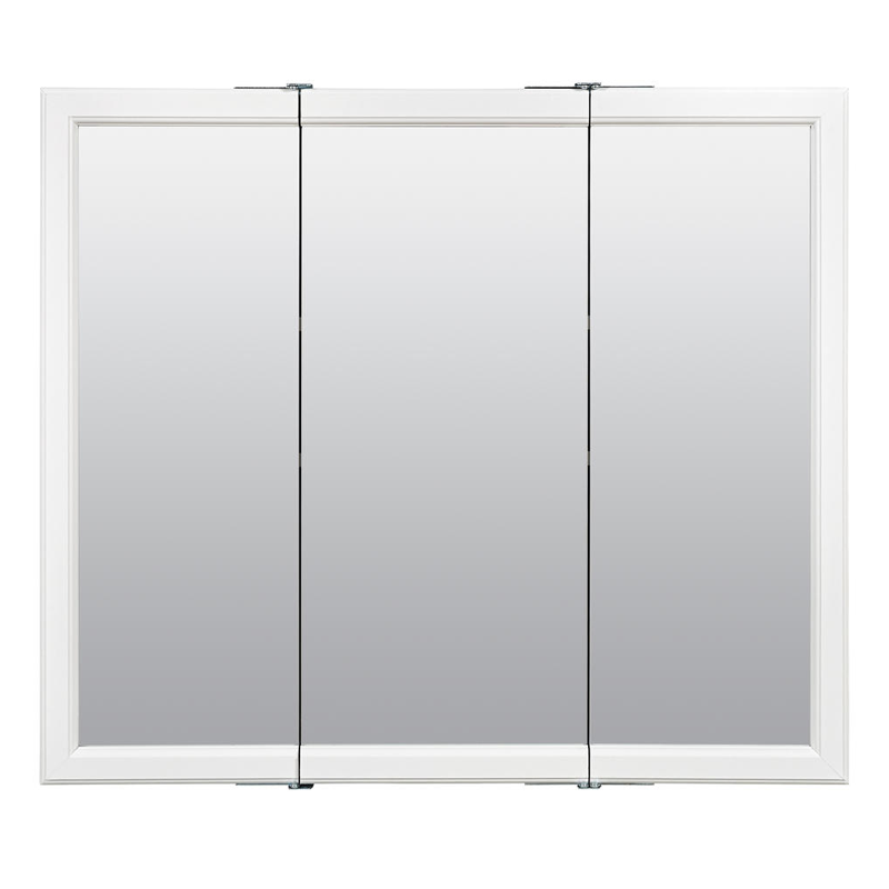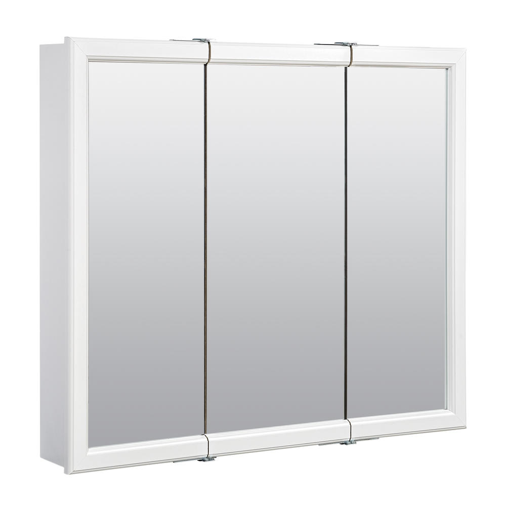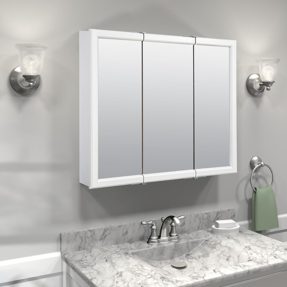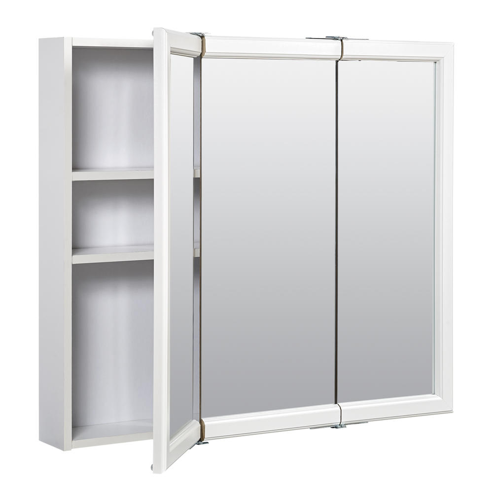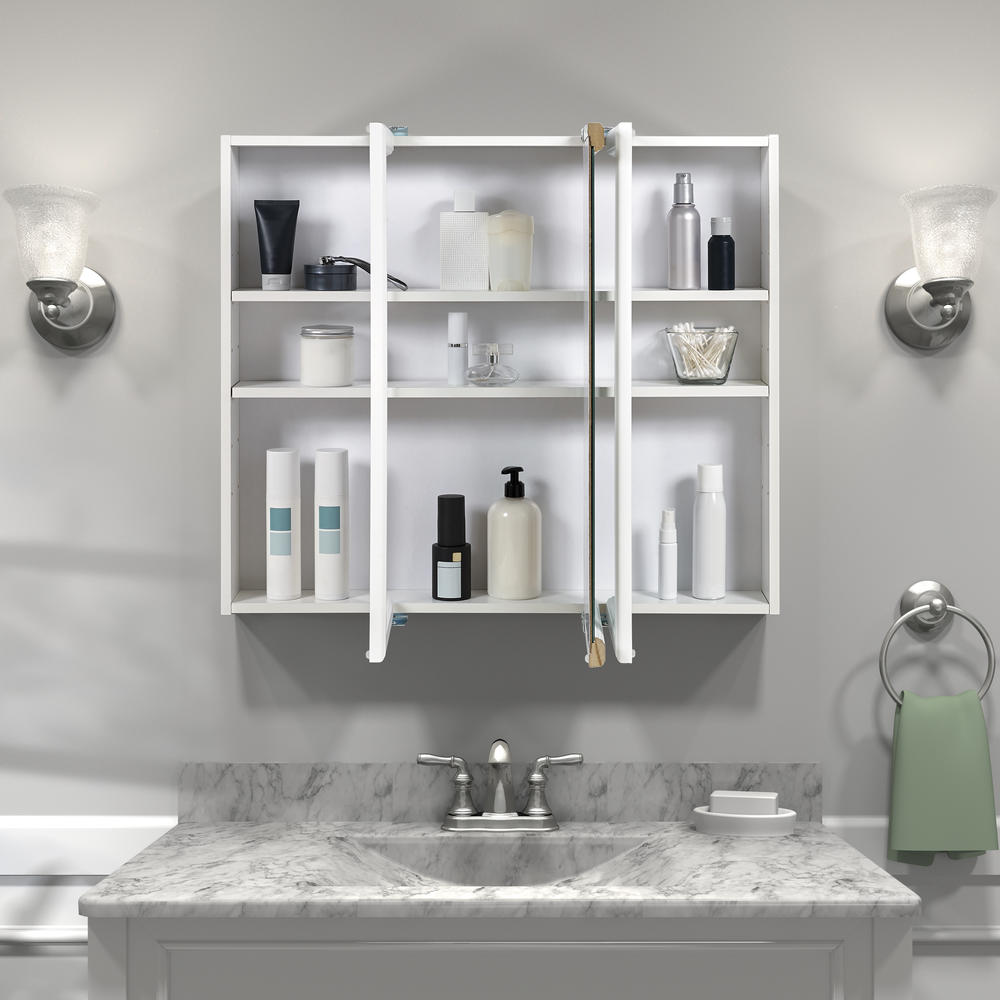 Add style and functionality to your bathroom with the Zenna Home 30 in. × 26 in. Tri-View Framed Surface Mount Medicine Cabinet. Designed with three mirrored doors, this cabinet provides a wide, multi-angle viewing area that makes grooming and daily routines easier. Behind the sleek mirrors, adjustable interior shelves offer customizable storage for toiletries, medications, and other essentials.