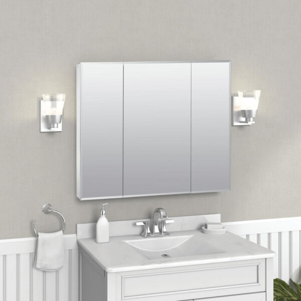Bring both function and style to your bathroom with the Zenna Home Beveled Tri-View 36″ x 30″ Surface Mount Medicine Cabinet. This elegant cabinet features three mirrored doors with beveled edges that open to reveal spacious, adjustable shelving for all your daily essentials. The tri-view design offers multiple viewing angles, perfect for grooming and makeup application, while the full-mirror front enhances light and space in your bathroom. Designed for easy surface mounting, it installs quickly and securely without the need for wall recessing.