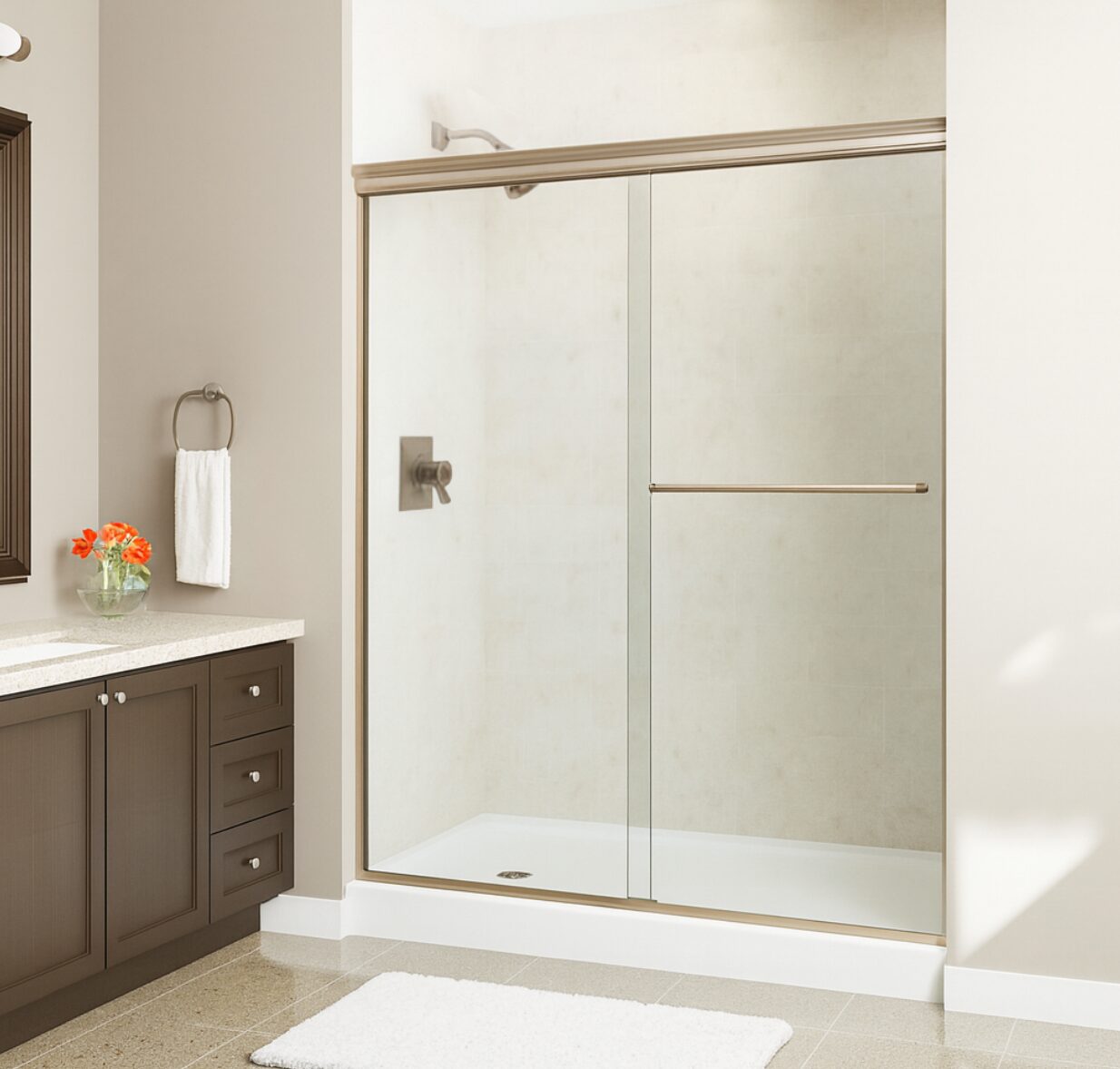 The 2500 Brushed Nickel frameless shower door with Duratuf® Clear glass from Contractors Wardrobe creates a sleek, modern aesthetic while maximizing the sense of space and openness in the bathroom. The Clear glass design allows natural light to flow freely and beautifully highlights the shower’s tile or stonework, giving the room an airy and sophisticated feel. Its Brushed Nickel finish adds a subtle, elegant touch, making it both stylish and easy to maintain. With its clean lines, durable construction, and smooth sliding functionality, this door provides a perfect balance of elegance and everyday practicality.