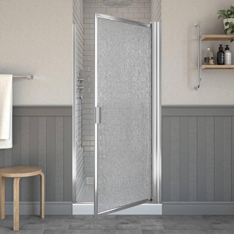 The 6100 Chrome framed shower door with Duratuf® Rain glass from Contractors Wardrobe provides both style and functionality, offering an elegant Chrome frame that complements a variety of bathroom designs while enhancing durability. The textured Rain glass adds a touch of sophistication and provides extra privacy by obscuring the view into the shower, making it ideal for shared bathrooms. Its pivot design allows for smooth opening and closing, maximizing accessibility even in tighter spaces. Additionally, the patterned surface of the glass helps reduce the visibility of water spots and streaks, making it easier to maintain a clean and polished appearance with less frequent cleaning
