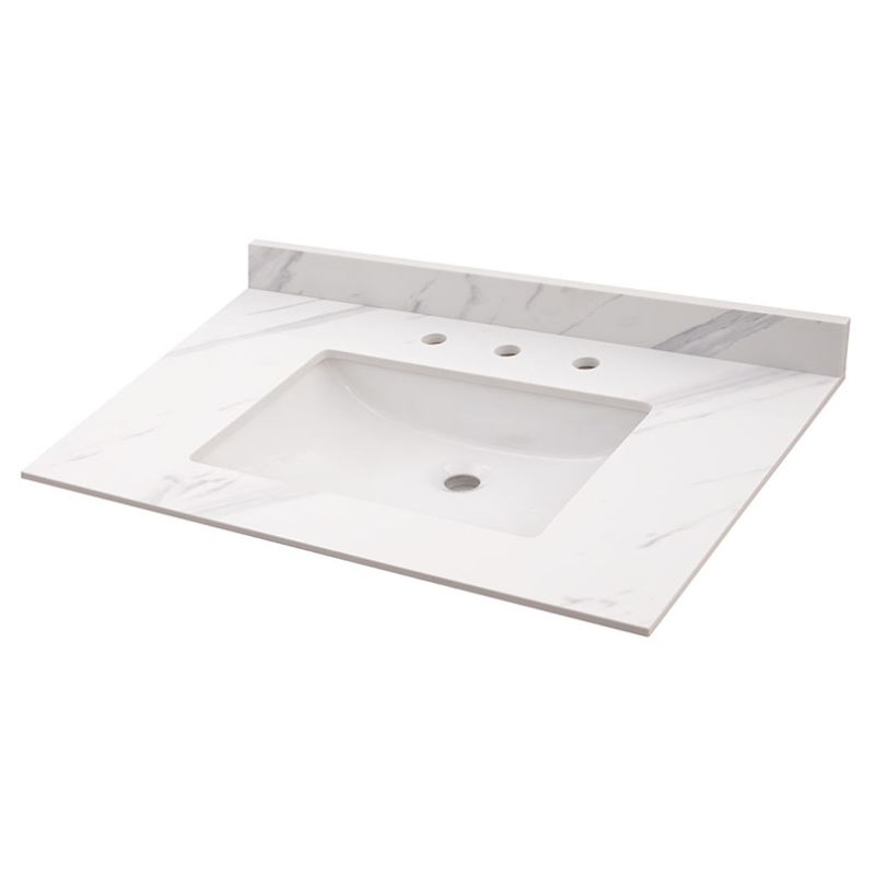 Create a calm, luxurious bathroom with the gorgeous marble look 49″ x 22″ Calacatta Lumas Vanity Top. A cool white background complemented by light gray veins provides a serene aesthetic and can work with any architectural style. This durable vanity top comes with an integrated rectangular sink for a sleek look and pre-drilled holes for easy faucet installation. Ideal for remodels or new-builds, this engineered marble vanity top comes with a matching backsplash to help protect walls, and a matching side splash is available. Several sizes and configurations are available, including single bowl and double bowl, to help you design your perfect space.
