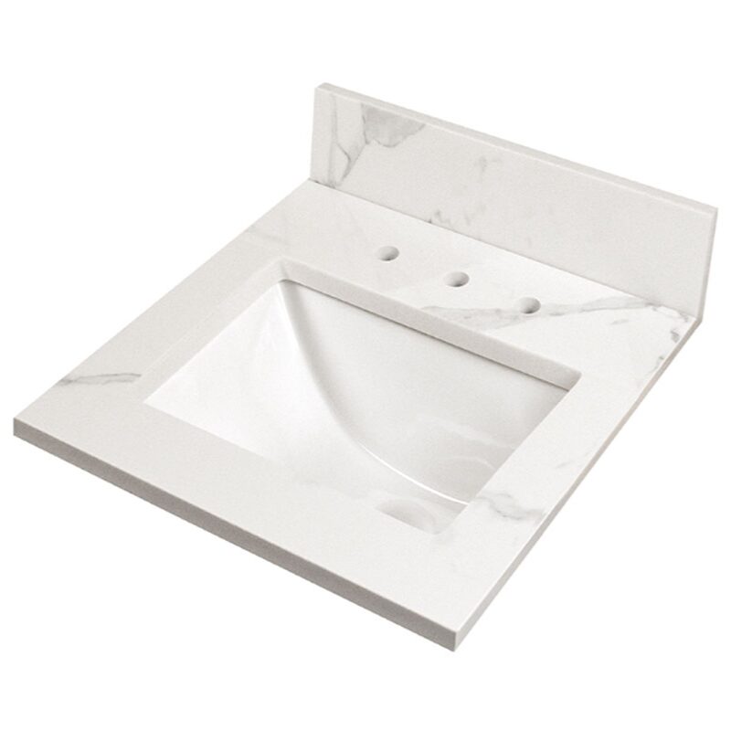 Create a luxurious bathroom with a 31″ x 22″ Calacatta Nowy marble look vanity top with sink. A cool white background complemented by light gray veins provides a serene aesthetic and can work with any architectural style. This durable vanity top comes with an integrated rectangular sink for a sleek look and pre-drilled holes for easy faucet installation. Ideal for remodels or new-builds, this engineered marble vanity top comes with a matching backsplash to help protect walls, and a matching side splash is available. Several sizes and configurations are available, including single bowl and double bowl, to help you design your perfect space.