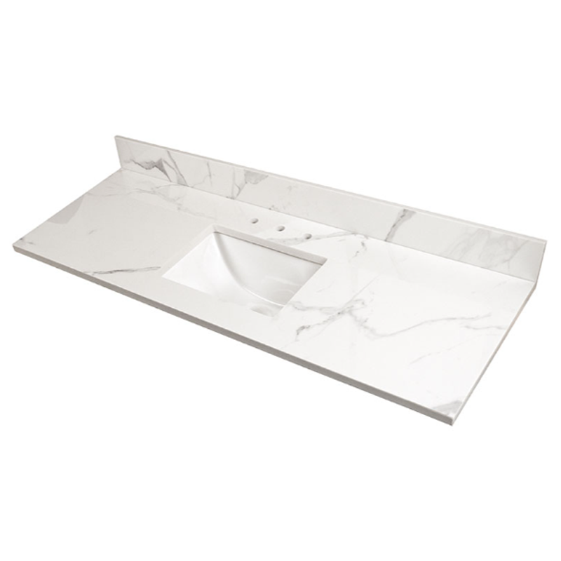 Create a luxurious bathroom with a 61″ x 22″ Calacatta Nowy marble look vanity top. A cool white background complemented by light gray veins provides a serene aesthetic and can work with any architectural style. This durable vanity top comes with an integrated rectangular sink for a sleek look and pre-drilled holes for easy faucet installation. Ideal for remodels or new-builds, this engineered marble vanity top comes with a matching backsplash to help protect walls, and a matching side splash is available. Several sizes and configurations are available, including single bowl and double bowl, to help you design your perfect space.