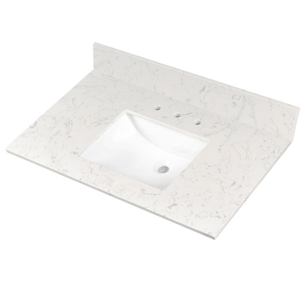 The 49″ x 22″ Carrara Sky Vanity Top is an affordable and beautiful marble look vanity top. Featuring a creamy white background complemented by darker veins, this durable vanity top comes with an integrated rectangular sink for a streamlined look and pre-drilled holes for easy faucet installation. Its flat edge design renders a contemporary finish for remodels or new-builds. This engineered marble vanity comes with matching backsplash to help protect walls from water damage. Matching side splash available. Offered in numerous sizes and configurations, including single bowl and double bowl, this vanity style can be used throughout your home for a signature look.
