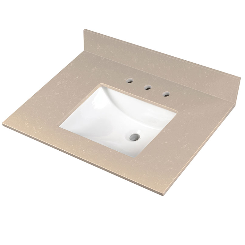 The 37″ x 22″ Cosmic Sand Vanity Top sets the stage for an affordable luxury bath. Featuring a beige background complemented by touches of white, this durable vanity top comes with an integrated rectangular sink for a streamlined look and pre-drilled holes for easy faucet installation. Its flat edge design and neutral color renders a contemporary finish for remodels or new-builds. This engineered marble vanity comes with matching backsplash to help protect walls from water damage. Matching side splash available. Offered in numerous sizes and configurations, including single bowl and double bowl, this vanity style can be used throughout your home.