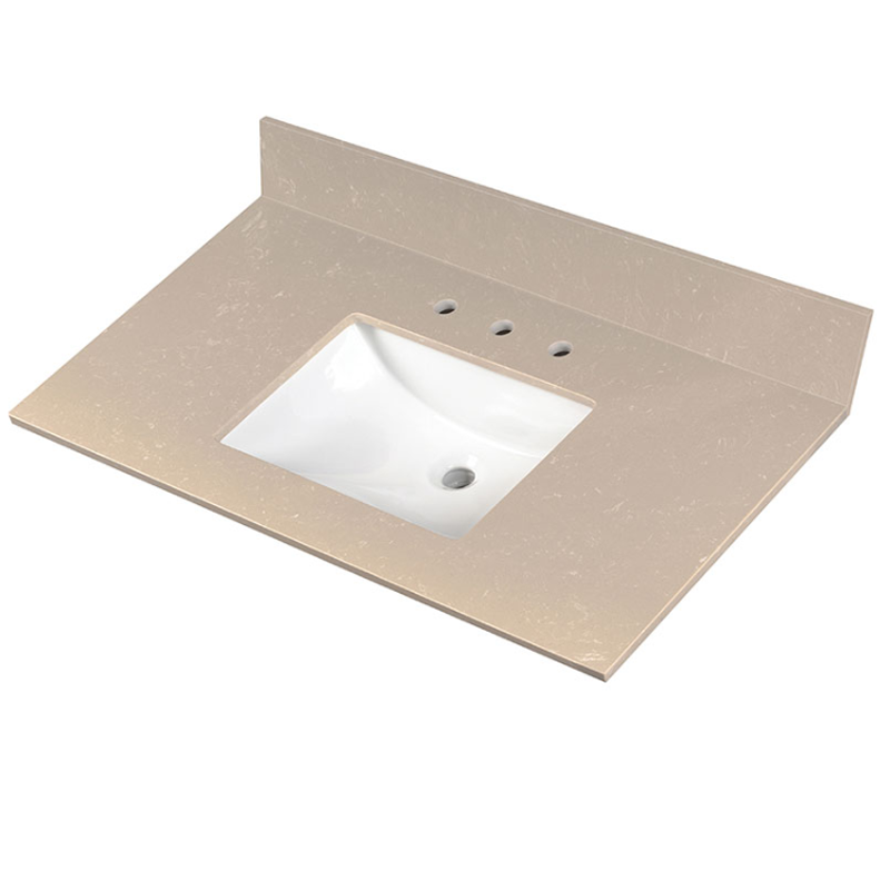 The 49″ x 22″ Cosmic Sand Vanity Top sets the stage for an affordable luxury bath. Featuring a beige background complemented by touches of white, this durable vanity top comes with an integrated rectangular sink for a streamlined look and pre-drilled holes for easy faucet installation. Its flat edge design and neutral color renders a contemporary finish for remodels or new-builds. This engineered marble vanity comes with matching backsplash to help protect walls from water damage. Matching side splash available. Offered in numerous sizes and configurations, including single bowl and double bowl, this vanity style can be used throughout your home.