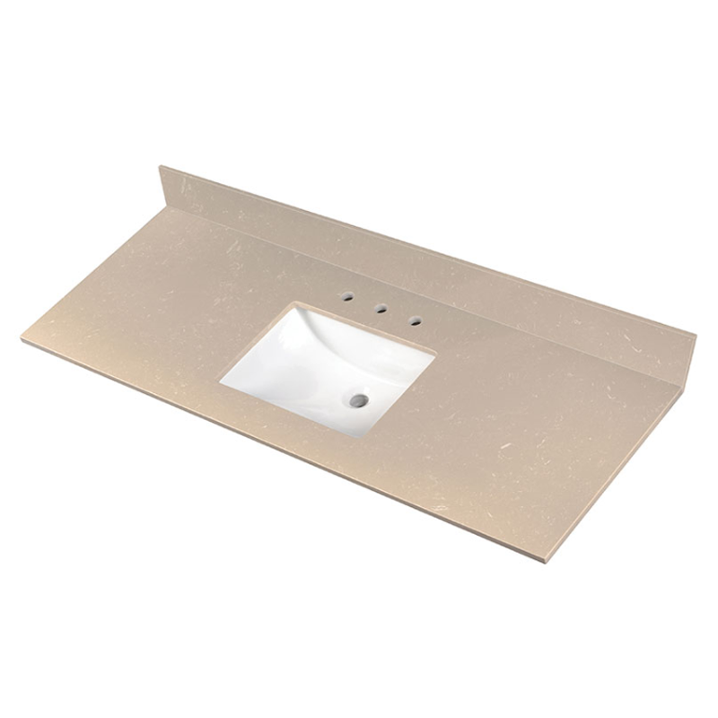 The 61″ x 22″ Cosmic Sand Vanity Top sets the stage for an affordable luxury bath. Featuring a beige background complemented by touches of white, this durable vanity top comes with an integrated rectangular sink for a streamlined look and pre-drilled holes for easy faucet installation. Its flat edge design and neutral color renders a contemporary finish for remodels or new-builds. This engineered marble vanity comes with matching backsplash to help protect walls from water damage. Matching side splash available. Offered in numerous sizes and configurations, including single bowl and double bowl, this vanity style can be used throughout your home.