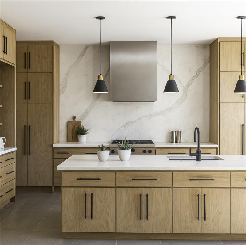 - Modern European-Style flat panel doors and drawer fronts with birch wood veneer
