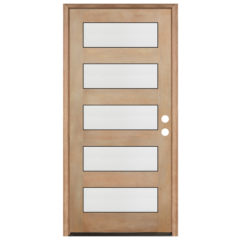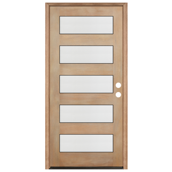 The Contemporary 5-Lite mahogany unfinished door is a modern entry door designed to bring a contemporary aesthetic to the exterior of a home. This door is available in factory prefinished and unfinished formats.