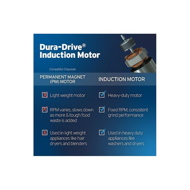 • DURABLE AND LONG-LASTING: Sink disposal featuring 1/3 HP Dura-Drive induction motor for maximum grinding power and durability; a single stage of grind to handle everyday food scraps; rugged, galvanized steel grind components