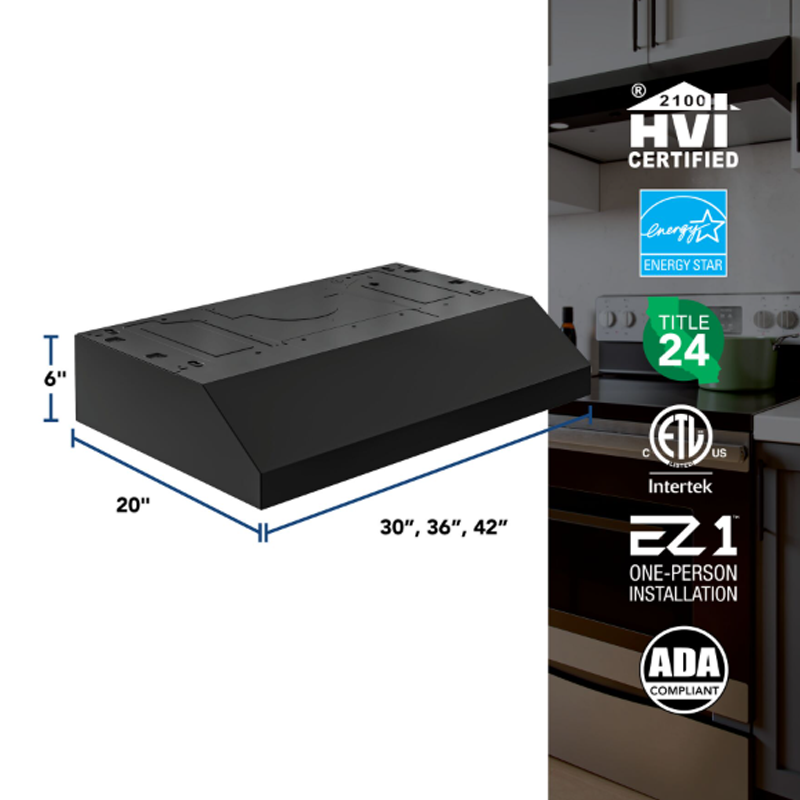 From the leader in residential indoor air quality, this under-cabinet range hood by Broan-NuTone is built to surpass industry standards with over 50 points of inspection, engineered as a reliable ventilation solution. The durable hood vent is up to 20% more effective at removing pollutants than the leading competitor with power ventilation at 350 Max Blower CFM to capture and remove smoke and odors from the kitchen. The Glacier range hood is also up to 44% quieter: 1.5 sones is equivalent to a refrigerator running, so it won’t interfere with daily life. The EZ1 Install System allows for a quick and easy 1-person installation, and the ENERGY STAR Certification is both code compliant and provides cost savings. The 1-Level LED lighting and a 2-Speed hidden rocker controls make cooking a breeze. At Broan-NuTone we believe that better quality of air means better quality of life.