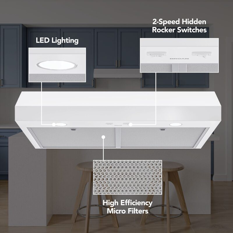 From the leader in residential indoor air quality, this under-cabinet range hood by Broan-NuTone is built to surpass industry standards with over 50 points of inspection, engineered as a reliable ventilation solution. The durable hood vent is up to 20% more effective at removing pollutants than the leading competitor with power ventilation at 350 Max Blower CFM to capture and remove smoke and odors from the kitchen. The Glacier range hood is also up to 44% quieter: 1.5 sones is equivalent to a refrigerator running, so it won’t interfere with daily life. The EZ1 Install System allows for a quick and easy 1-person installation, and the ENERGY STAR Certification is both code compliant and provides cost savings. The 1-Level LED lighting and a 2-Speed hidden rocker controls make cooking a breeze. At Broan-NuTone we believe that better quality of air means better quality of life.