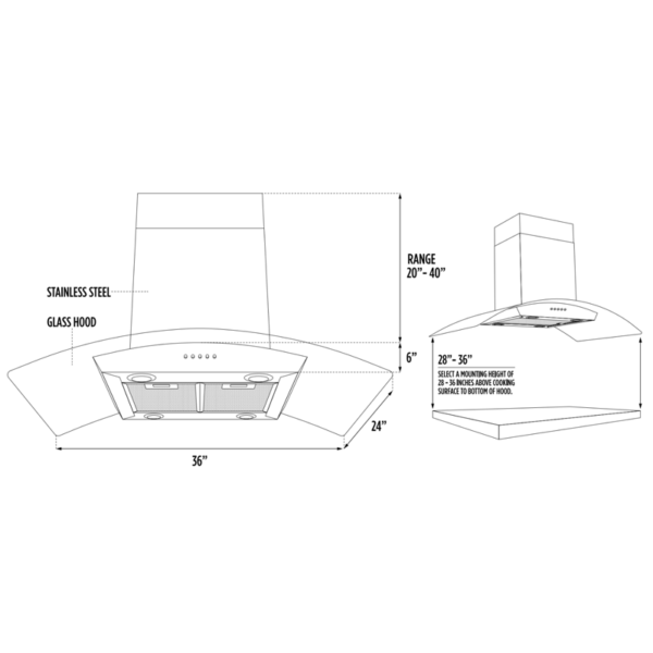 Add a striking centerpiece to your kitchen with the 36-inch Stainless Steel Arched Glass Island Range Hood. Designed to impress from every angle, this elegant hood combines a curved tempered glass canopy with brushed stainless steel for a contemporary, high-end look.